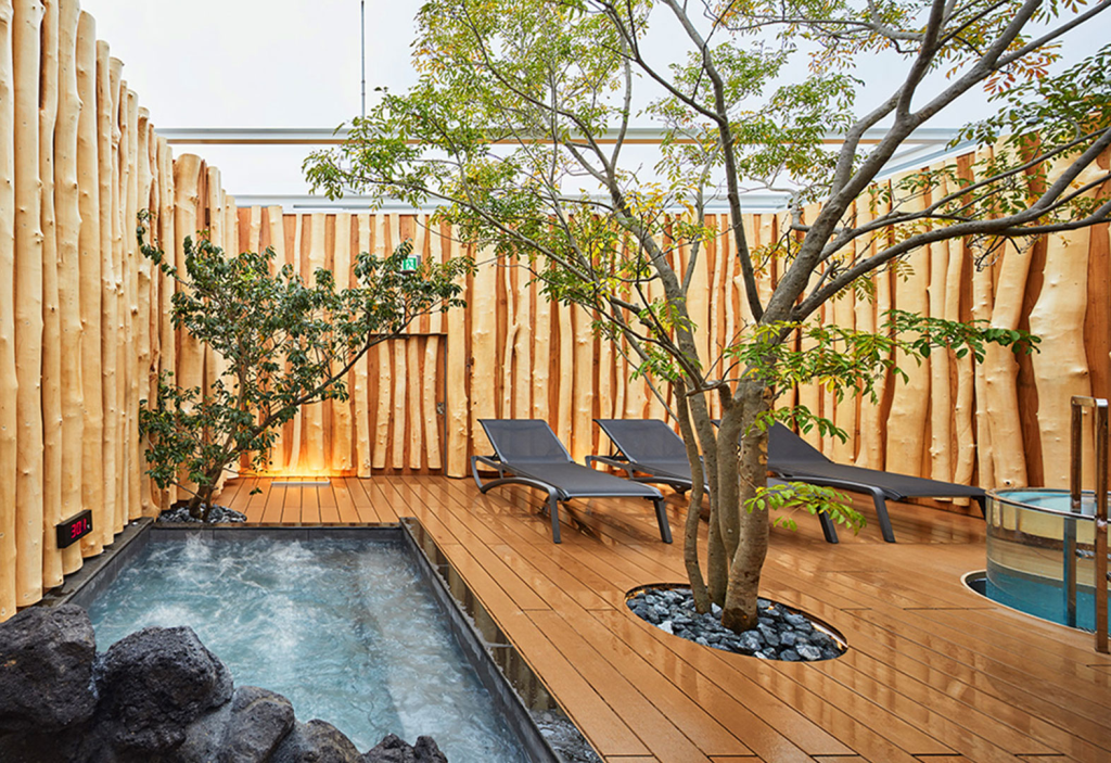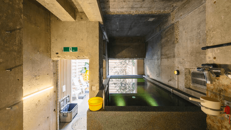 A personal sauna with a capacity for one (be prepared to wait in line), the barrel steam sauna is made of Koya Pine from Wakayama Prefecture in western Japan, as well as Himalayan and Nanyang cedar. These types of wood give the sauna rot-resistance from the steam exposure, as well as a nice woodsy aroma you can smell inside the sauna. Each person only gets around six minutes in the sauna, but trust me: that is ample time. The barrel sauna gets incredibly hot, and will have you running into the near-freezing cold plunge nearby!