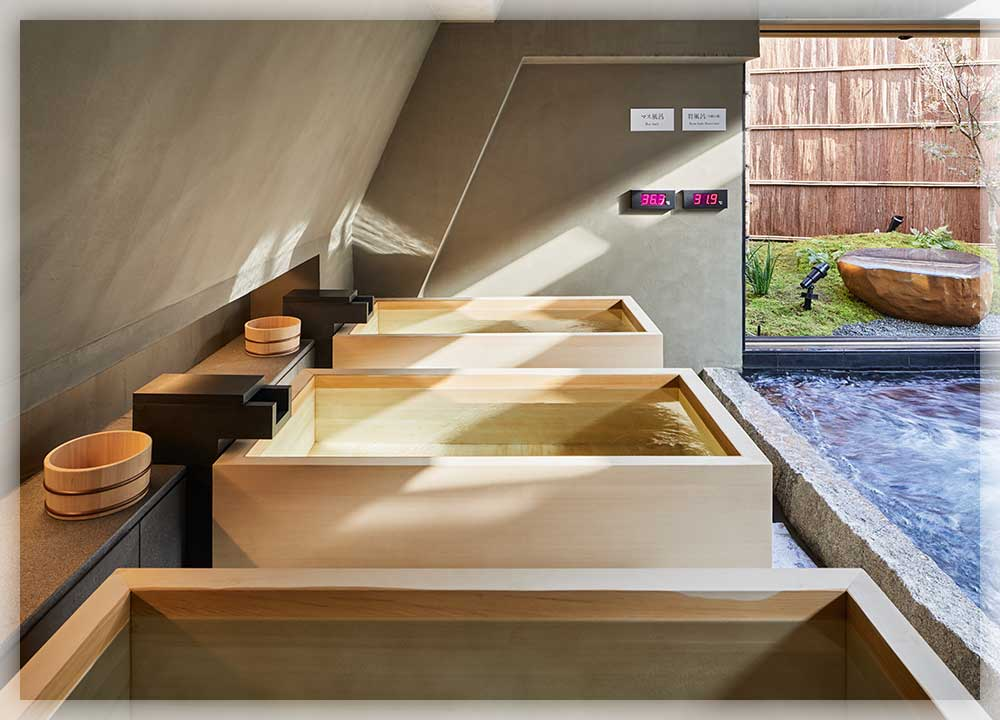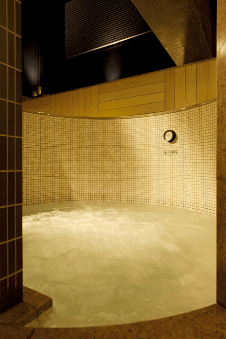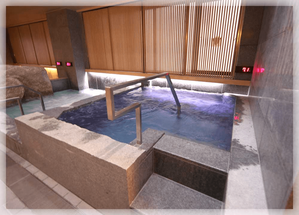 The box bath uses Aomori Hiba wood, a type of Cypress wood historically used in the construction of temples, and has a refreshing aroma well suited for baths. Lying down in the body length bath gives a regal feeling, especially situated next to the visible outdoor garden and up the stairs from the majority of the sauna and baths. These baths are fairly hot at around 42 degrees (107 Fahrenheit), so it does’t take long to get the most out of these baths.