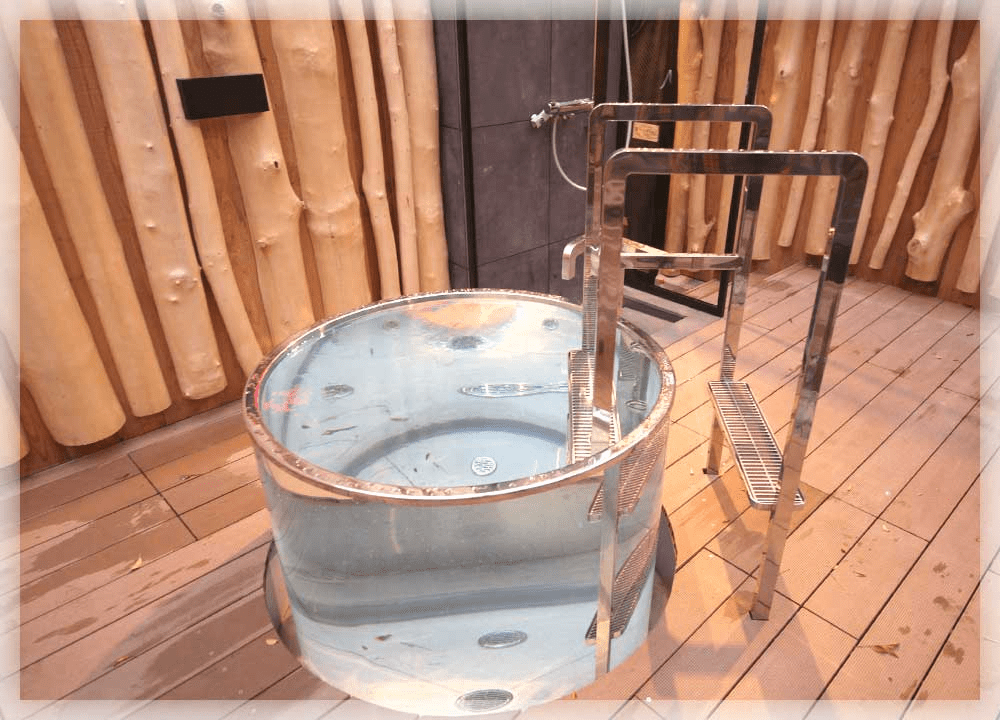 This one is cold! I mean really cold! The temperature is above freezing at around 8-9 degrees (around 45 degrees). On its own, this can be cold but bearable. However, what really takes this pool up a notch is the hot-tub style jets that keep the water moving at all times. This makes the water feel close to freezing for an always exhilarating, often intense experience. Great after a high heat sauna session. Be careful with this one, especially if you are new to sauna!